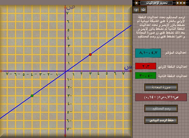 رسم مستقيم بمعلومية نقطتين : يمكن للطالب فى هذا القسم ان يرسم الخط المستقيم عند تعيين احداثيات اي نقطتين على الشبكة ليس هذا فقط و انما يكتب البرنامج معادلة الخط المستقيم الذي تم رسمه.
